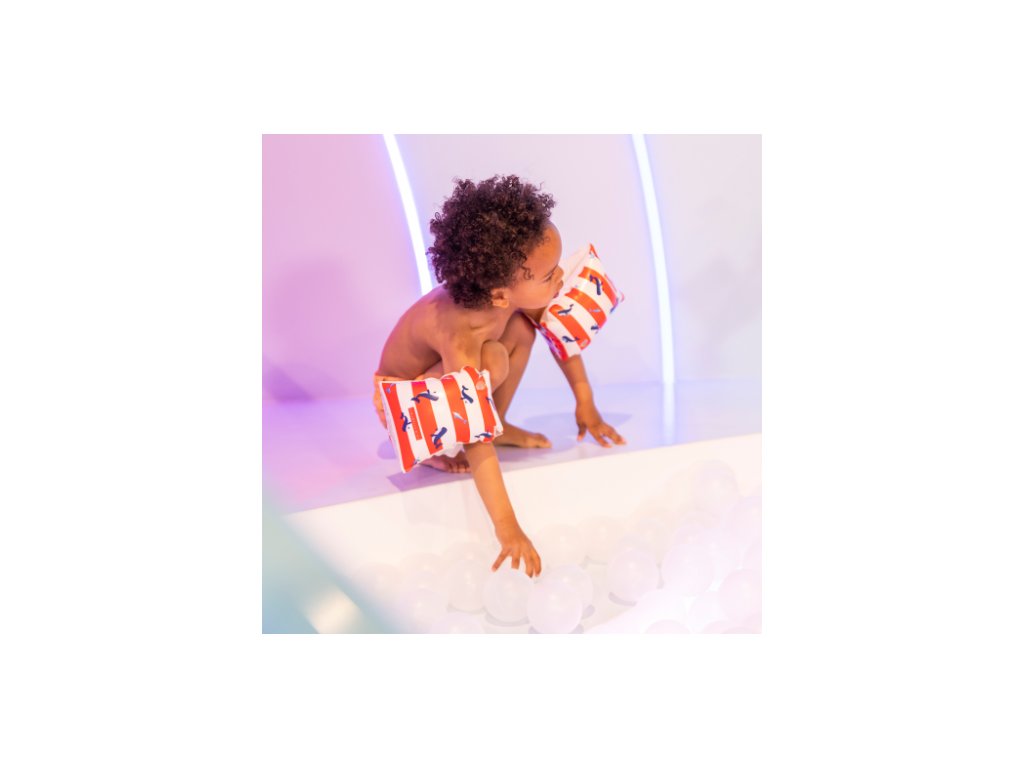 Vďaka výraznému a originálnemu vzhľadu ich budete dobre vidieť aj z diaľky. Majú tiež bezpečnostné ventily, vďaka ktorým z nich pri neočakávanom otvorení neuniká vzduch. Veľkosť rukávnikov na plávanie je 17 x 14 cm.